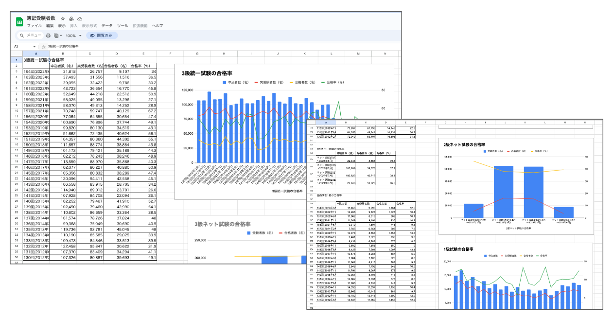 内容:日商簿記の申込者数・実受験者数・合格者数・合格率について調べてください。